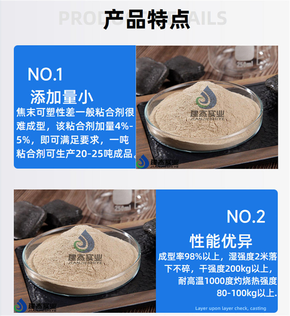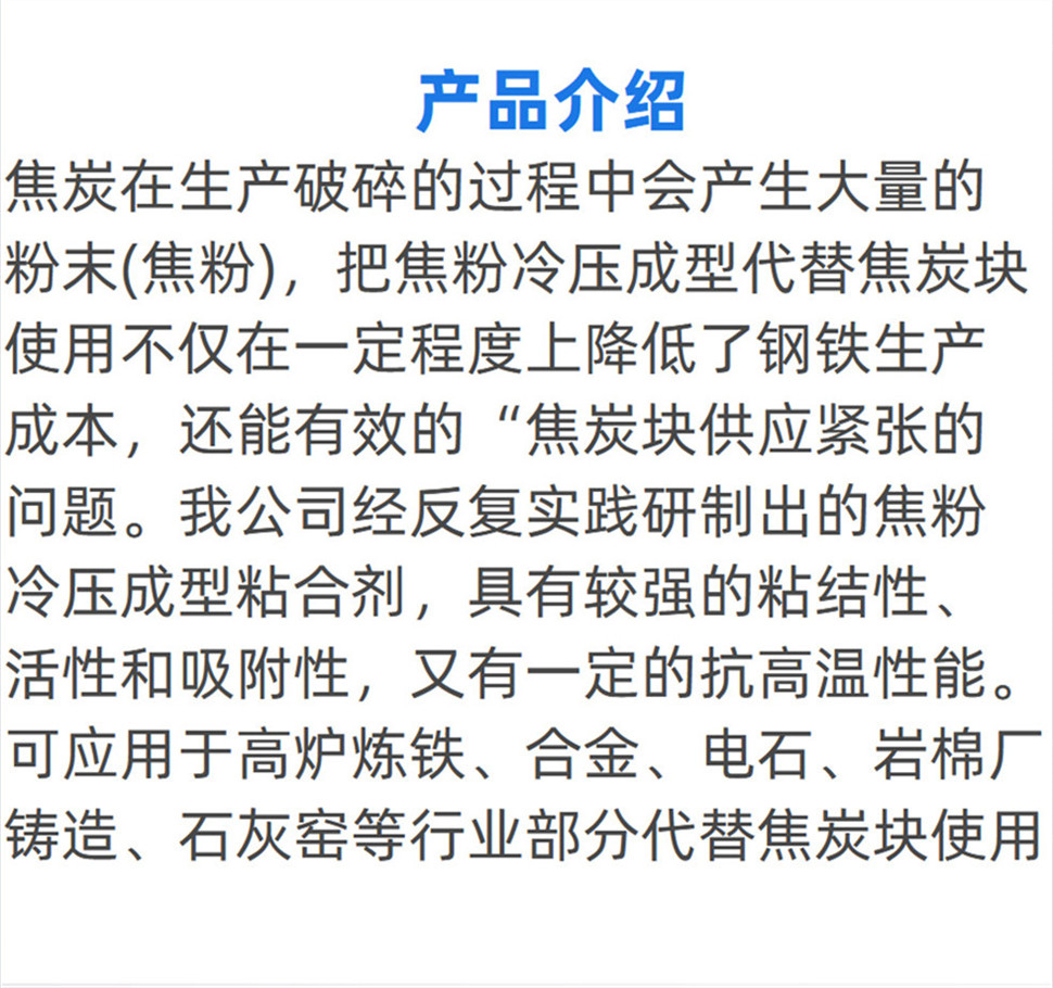 产品先容:焦炭在生产破碎的历程中会爆发大宗的粉末(焦粉),,,,,,,把焦粉冷压成型取代焦炭块使用不但在一定水平上降低了钢铁生产本钱,,,,,,,还能有用的*焦炭块供应主要的问题。。。。。。。我公司经重复实践研制出的焦粉冷压成型粘合剂,,,,,,,具有较强的粘结性、活性和吸附性,,,,,,,又有一定的抗高温性能……