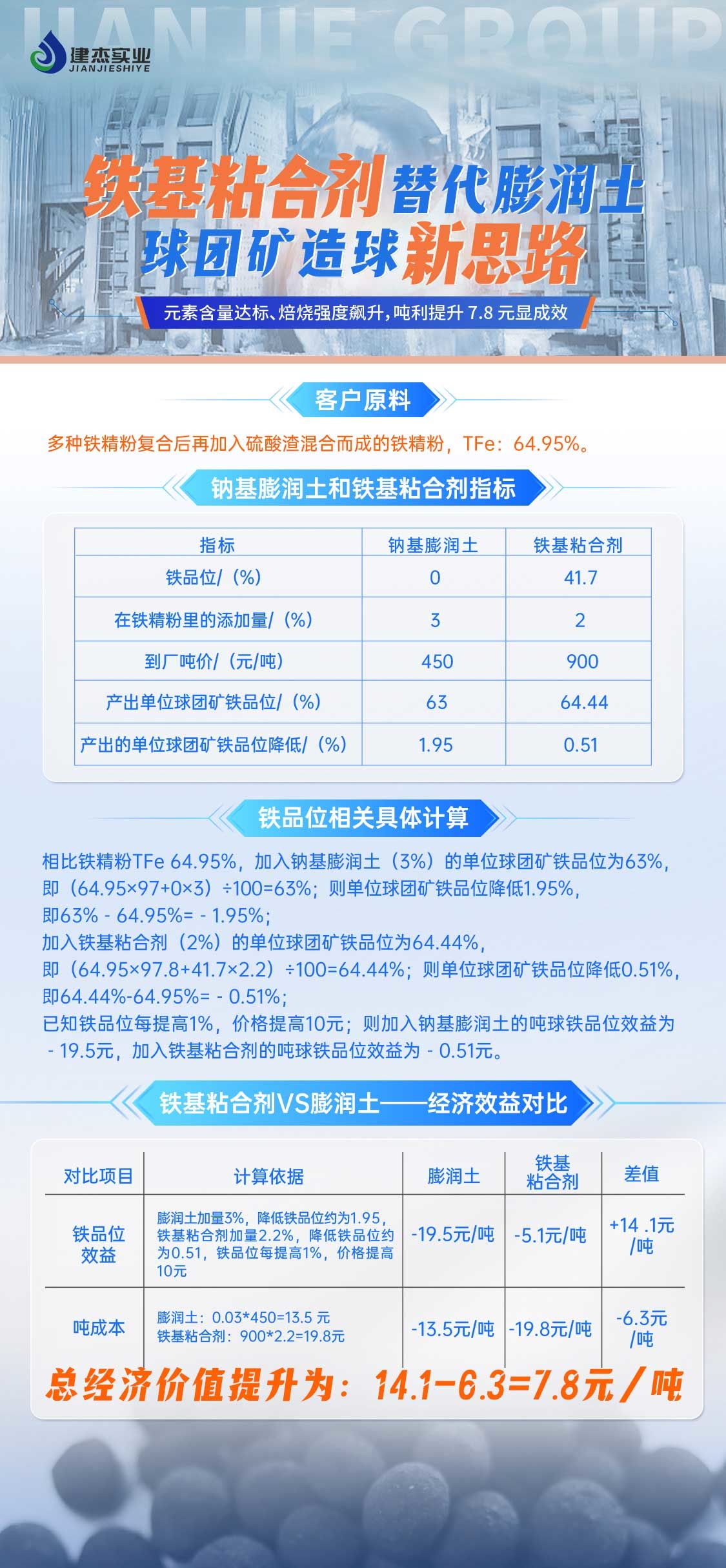 在铁品位效益上,,,,,钠基膨润土为 -19.5 元 / 吨,,,,,铁基粘合剂为 -5.1 元 / 吨,,,,,差值达 +14.1 元 / 吨 。。。。。。吨本钱方面,,,,,钠基膨润土:0.03450 = 13.5 元 / 吨;;;;;;;铁基粘合剂:9002.2% = 19.8 元 / 吨 ,,,,,差值为 -6.3 元 / 吨 。。。。。。综合来看,,,,,总经济价值提升为 14.1 - 6.3 = 7.8 元 / 吨 。。。。。。